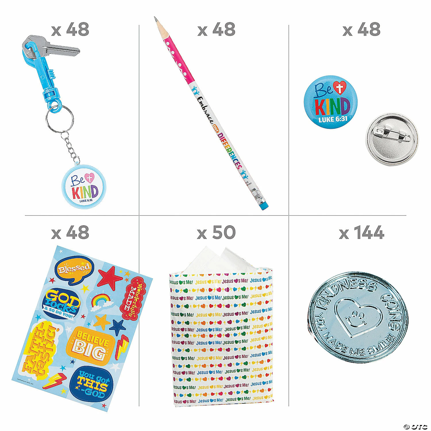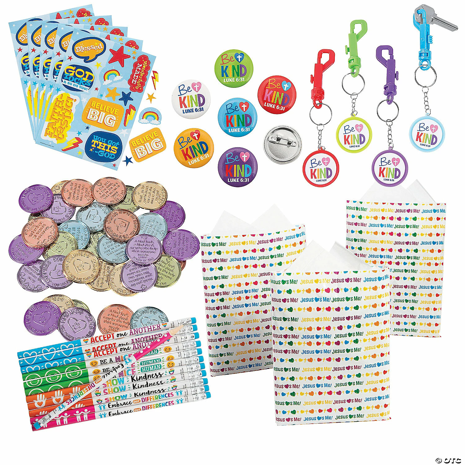 Spread kindness in a big way! These handout kits include everything you need to get kids stoked for sharing compassion and the love of God with others. From colorful jewelry to stationery to other treasures, kids will love receiving these bags full of blessings as church event prizes, Sunday School rewards and other giveaways. (386 pcs. per unit) Simple assembly required. Assortment may vary.Includes:• 12 Plastic Be Kind Backpack Clip Keychains (1 1/4″ diam. with a 2″ plastic clip.)• 48 Metal Be Kind Mini Buttons (1″ diam.)• 24 Wood Humankind & Diversity Pencils (7 1/2″)• 50 Plastic Large Jesus Loves Me Treat Bags (12 1/2″ x 17″)• 144 Plastic Kindness Coins (1 1/2″)• 48 Paper Religious Positivity Sticker Sheets (Each 5″ x 7″ sheet contains 11 assorted stickers.)