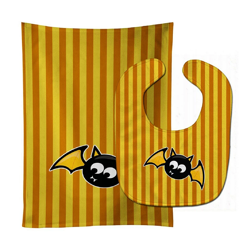 Halloween Bat Orange Stripes Baby Bib & Burp Cloth. Celebrate Halloween with this Halloween Bib & Burp Cloth. Baby Bib and Burp Cloth Set that is both Cute and Functional. Dyed plush fabric baby bib with Velcro closure. Made of ultra-smooth micro-mink polyester that reverses to 100% cotton terry loops. Measures 10 inches x 13 inches, 0.8 oz. per piece. Edges are finished with binding. Plus a Dyed plush fabric baby burp cloth. Made of ultra-smooth micro-mink polyester that reverses to 100% cotton terry loops. Measures 11 inches x 18 inches, 0.8 oz. per piece. Edges are finished with binding. Machine washable and dry on low heat. Fade resistant and stain resistant. Top fabric gets even softer after the first wash.