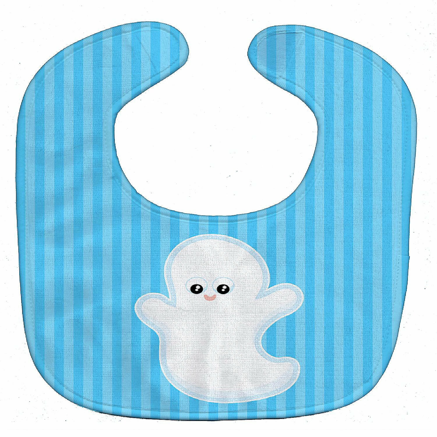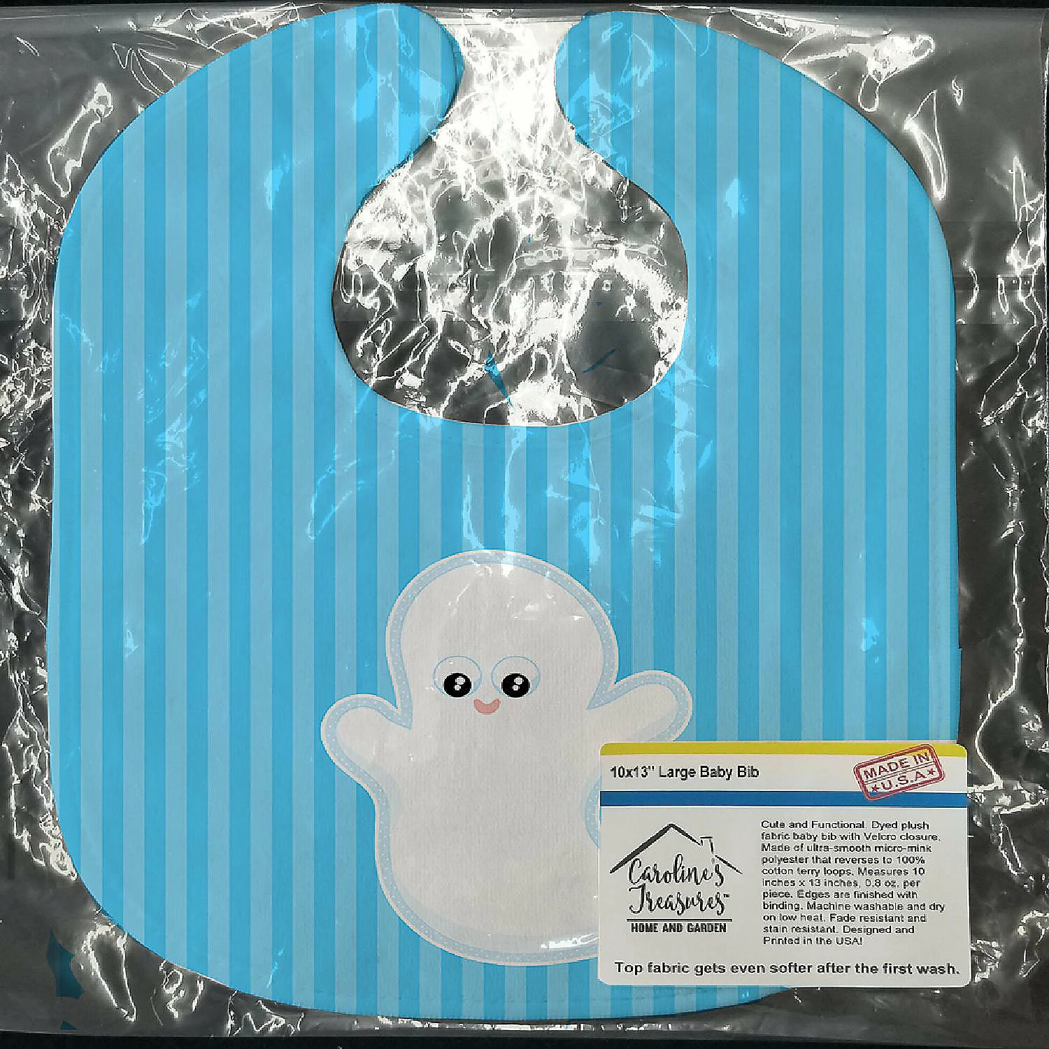 Halloween Ghost Baby Bib. Celebrate Halloween with this Halloween Baby Bib. Cute and Functional. Dyed plush fabric baby bib with Velcro closure. Made of ultra-smooth micro-mink polyester that reverses to 100% cotton terry loops. Measures 10 inches x 13 inches, 0.8 oz. per piece. Edges are finished with binding. Machine washable and dry on low heat. Fade resistant and stain resistant. Top fabric gets even softer after the first wash.