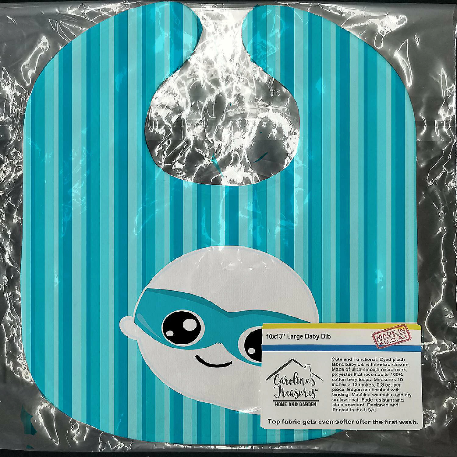 Halloween Ghost Superhero Baby Bib. Celebrate Halloween with this Halloween Baby Bib. Cute and Functional. Dyed plush fabric baby bib with Velcro closure. Made of ultra-smooth micro-mink polyester that reverses to 100% cotton terry loops. Measures 10 inches x 13 inches, 0.8 oz. per piece. Edges are finished with binding. Machine washable and dry on low heat. Fade resistant and stain resistant. Top fabric gets even softer after the first wash.