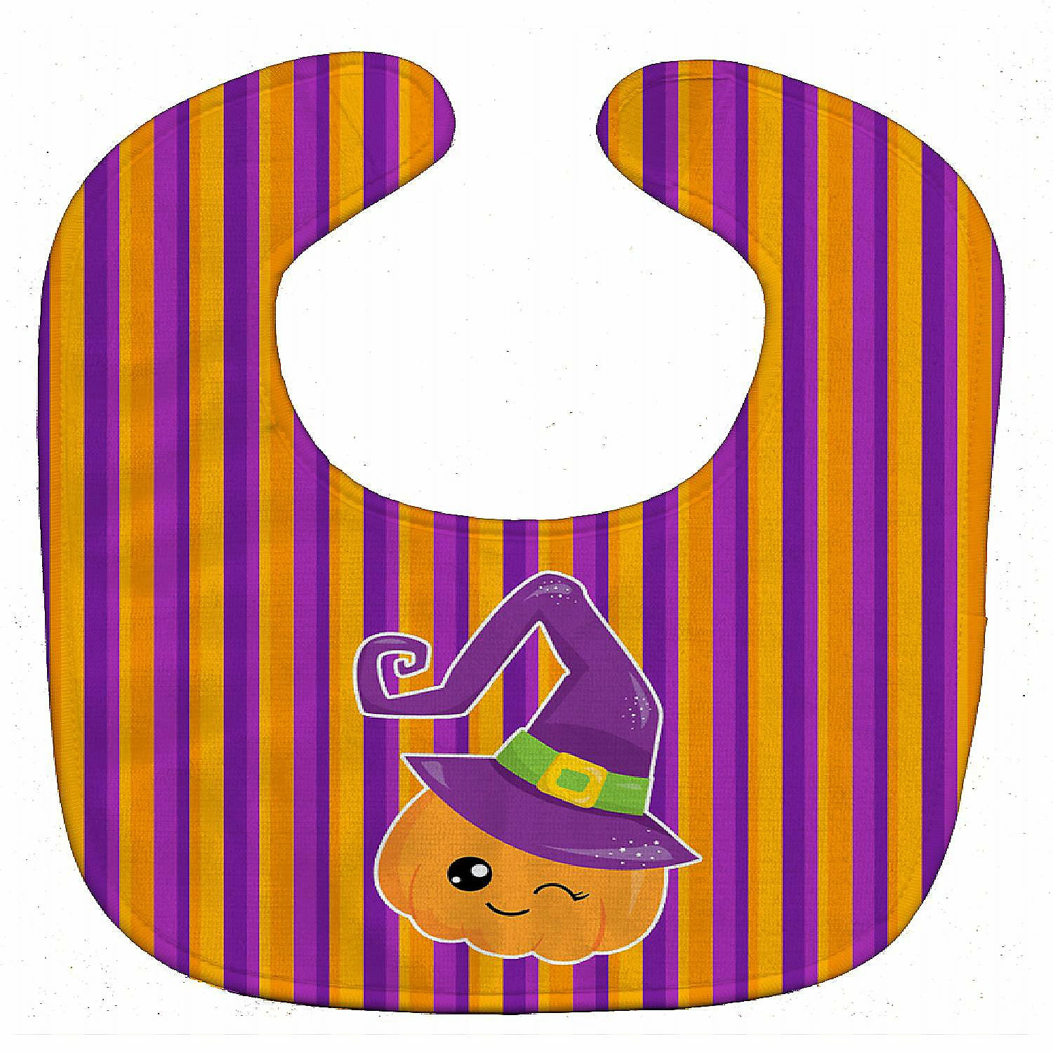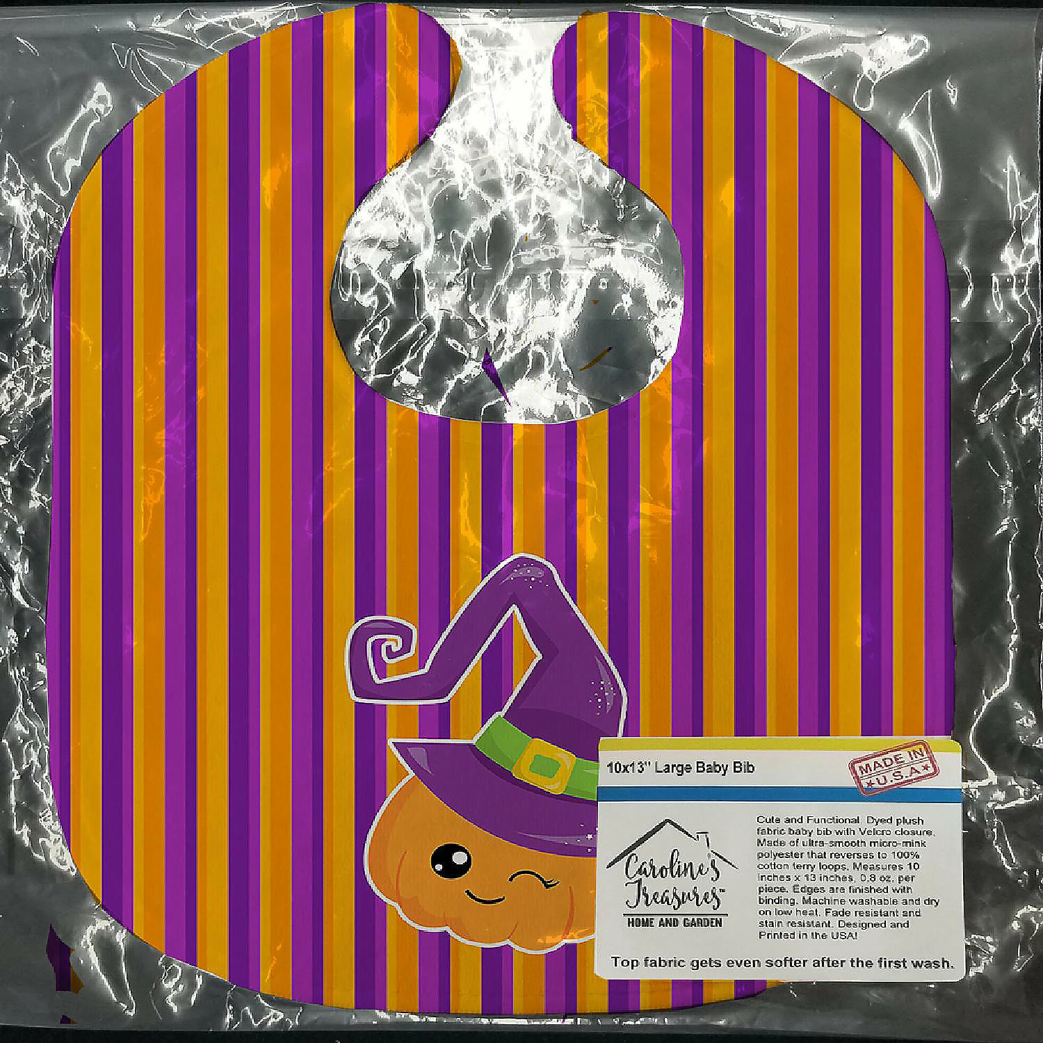 Halloween Pumpkin Witch Baby Bib. Celebrate Halloween with this Halloween Baby Bib. Cute and Functional. Dyed plush fabric baby bib with Velcro closure. Made of ultra-smooth micro-mink polyester that reverses to 100% cotton terry loops. Measures 10 inches x 13 inches, 0.8 oz. per piece. Edges are finished with binding. Machine washable and dry on low heat. Fade resistant and stain resistant. Top fabric gets even softer after the first wash.