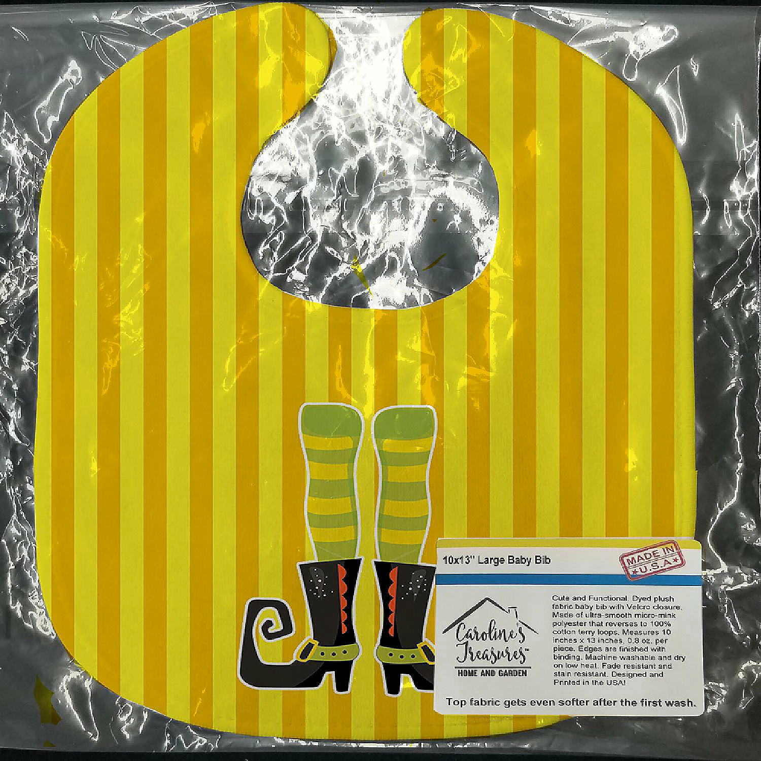 Halloween Witch’s Legs #2 Baby Bib. Celebrate Halloween with this Halloween Baby Bib. Cute and Functional. Dyed plush fabric baby bib with Velcro closure. Made of ultra-smooth micro-mink polyester that reverses to 100% cotton terry loops. Measures 10 inches x 13 inches, 0.8 oz. per piece. Edges are finished with binding. Machine washable and dry on low heat. Fade resistant and stain resistant. Top fabric gets even softer after the first wash.