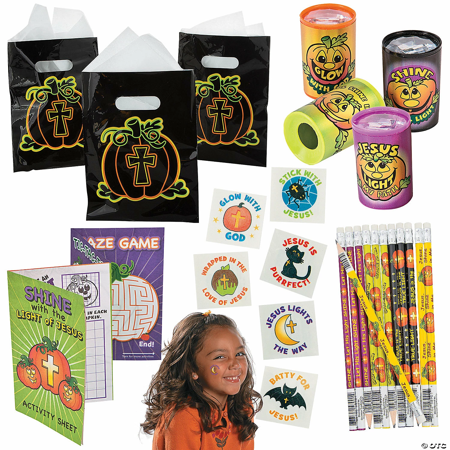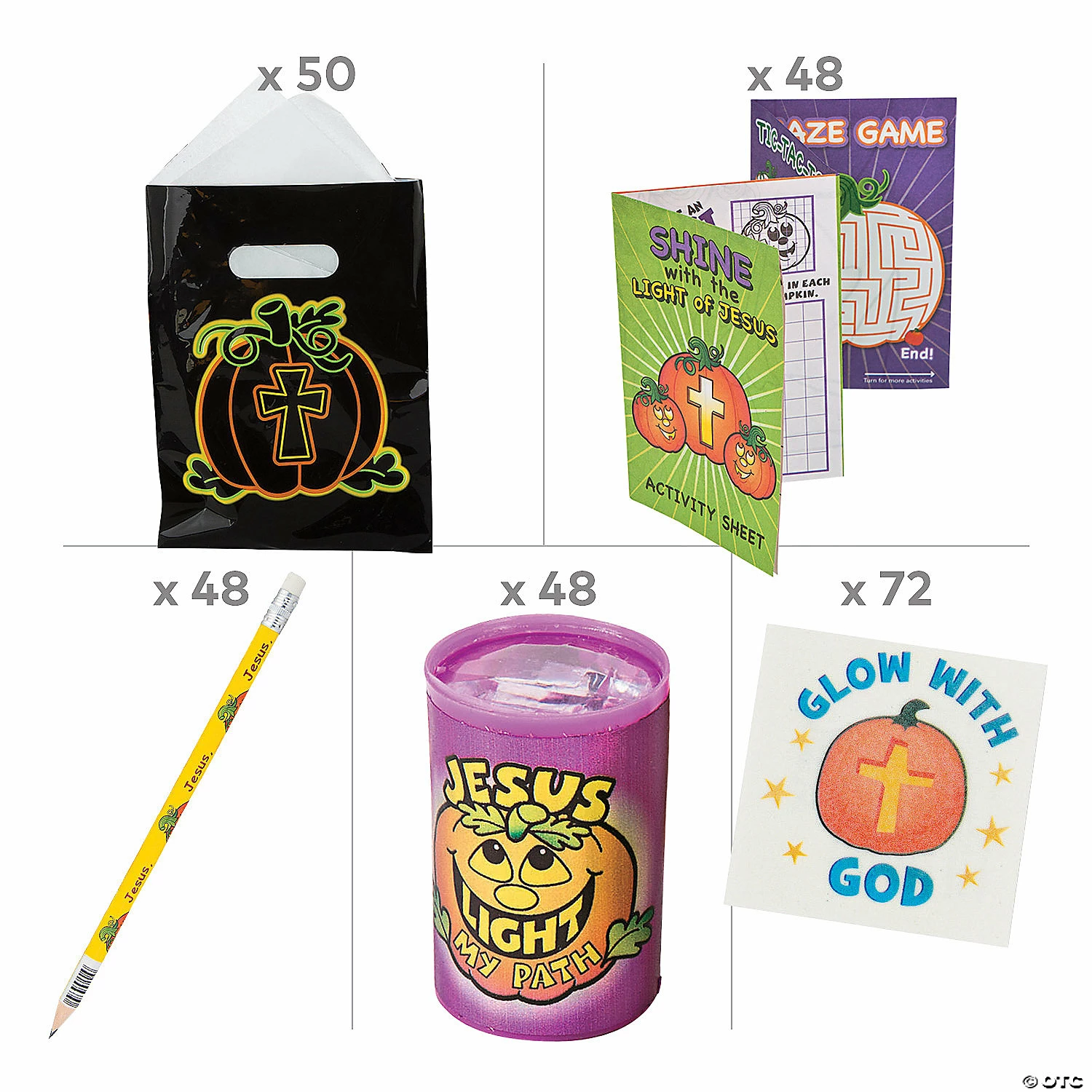Just as jack-o’-lanterns are known for shining their light bright, so do Christians shine the light of Jesus for all to see! Stuff the included goody bags with the fun candy alternatives in this kit and watch the smiles light up little ones’ faces. Great for handing out during trunk-or-treat events or as Sunday School rewards, fall birthday party favors and other giveaways. (338 pcs. per unit) Simple assembly required. Assortment may vary.Includes:• 144 Little Boolievers Tattoos (Easy to apply and remove. Safe and non-toxic. 1 1/2″)• 48 Plastic Science VBS Prisms (1 3/4″)• 50 Plastic Neon Christian Pumpkin Goody Bags (7″ x 9 1/2″)• 48 Wood Christian Pumpkin Pencils (7 1/2″)• 48 Paper Christian Pumpkin Fold-Up Activity Sheets (Includes 7 fun activities that unfold into a full 8 1/2″ x 11″ coloring page)