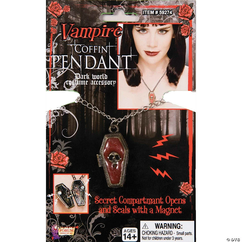 Coffin Pendant Necklace. Perfect addition to your witch, vampire,sorceress or emo gothic teen costume. Includes: Coffin pendant has a secret compartment that opens and seals with a magnet.Special Shipping Information: This item ships separately from other items in your order. This item cannot ship to a P.O. Box. This item may be subject to additional processing days.ITEM IS NOT ELIGIBLE FOR EXPEDITED SHIPPING