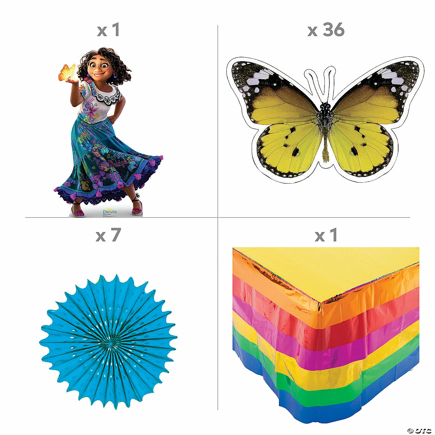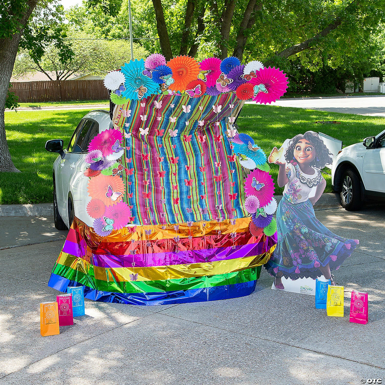 Trunk or treat, give them something fun to see! This bright and colorful trunk or treat kit features the beautiful butterflies that make numerous appearances in the enchanted Encanto movie, symbolizing transformation as well as acceptance. Perhaps more importantly, they’ll help your trunk or treat station stand out and get noticed! (71 pcs. per unit)Includes:• 12 Foil Gold Metallic Balloon Weights (5 1/2″)• 1 Cardstock 3D Butterfly Ombre Curtain Backdrop (6 ft. x 6 ft.)• 1 Cardboard Disney’s Encanto Mirabel with Butterfly Stand-Up (39″ x 60″ Stand-ups are one-sided with a brown cardboard back. Simple assembly required.)• 12 Paper Fiesta Luminary Bags (Not flame retardant. Recommended for use with battery-operated tea lights. 5″ x 10″)• 1 Plastic Fiesta Metallic Ruffle Table Skirt (Includes elastic to keep skirt in place. 9 ft. x 29″)• 7 Cardstock Realistic Photo Colorful Paper Fan Cutouts (16″ – 22 1/4″ Fan design is printed. Simple assembly required.)• 1 Plastic Serape Fiesta Tablecloth (Disposable. 54″ x 108″)• 36 Cardstock Schoolgirl Style™ Woodland Whimsy Butterfly Bulletin Board Cutouts (4″ x 5 1/2″)• Assortments are subject to change at any time and may vary from picture shown. Substituted items will be similar in nature.