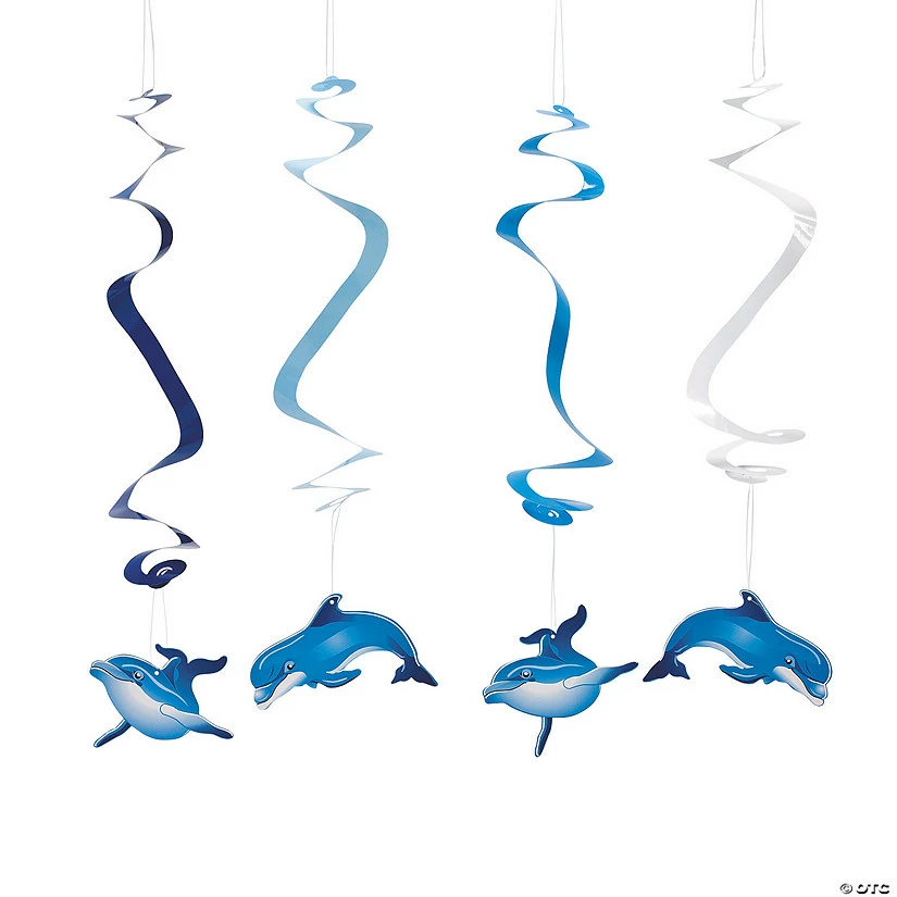 Dolphin Hanging Party Swirls are an ideal party decoration for almost any celebration! Use them for birthday parties, luaus, graduation parties, ocean theme school parties – the possibilities are endless. These pretty twisting mobiles can even be used as room décor; they look great suspended above an aquarium. Check out our other dolphin party supplies here on our website. Paper. Hangs approx. 28″. © OTC