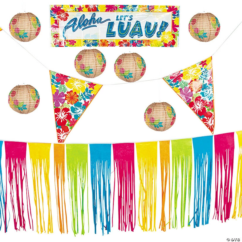 Your luau will be grand when you add some hot hibiscus patterns to your party supplies! Create a tropical paradise with paper lanterns, bright banners and more island party décor. This decorating kit will make waves for a Hawaiian prom theme or paradise beach party birthday bash. Includes six 10″ paper lanterns, a 52 1/2″ plastic banner, a 9-ft. nonwoven polyester table skirt and a 24-ft. polyester pennant banner. (9 pcs. per set) © OTC