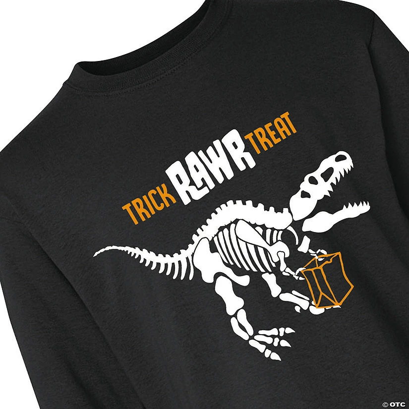 Get ready for a roaring great time this Fright Night! Super adorable and comfy, this long sleeve Halloween T-shirt features a dino-mite design of a skeleton T-Rex going trick-or-treating. More cute than creepy, apparel like this is sure to be a favorite with kiddos of all ages. And the fun of wearing it never goes extinct! In the days leading up to All Hallows Eve, don’t be surprised if they sport this style again and again! © OTC• Brand: Gildan• Long sleeve• Preshrunk 100% cotton, 5.3 oz. • Seamless three-quarter collar• Taped neck rolled shoulders• Tearaway label• Double-needle collar, sleeve and bottom hems• Rib cuffs• CPSIA tracking label compliant• Need more? With our tees, we’ve got your back (and front)! To order in bulk for any size group, just call 1-877-513-0384. Or, give us a ring if you’d like to easily customize any of our pre-printed shirts with our free design service.