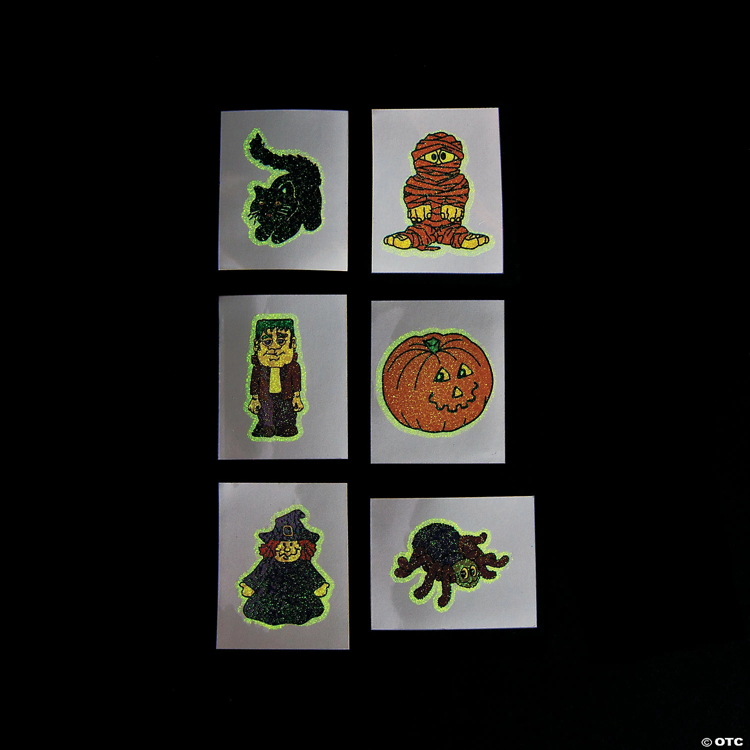 Glow-In-The-Dark Halloween Tattoos. For a ghostly glow, wear these spooky tattoos with your Halloween costume! You can also hand out these pumpkins, monsters, black cats and other creepy critters to trick-or-treaters for a fun alternative to candy. Easy to apply and remove. Safe and non-toxic. (6 dozen per unit) 1 1/2″ Expose items to daylight to activate glow. © OTC
