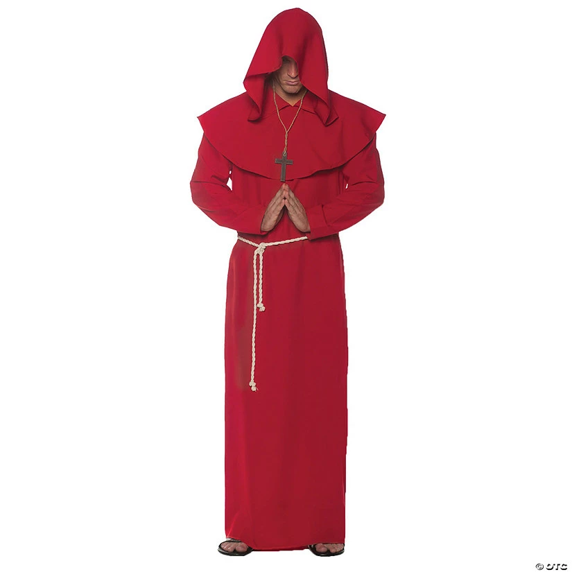 A great monk’s robe with many uses. Comes with red robe and matching collar with attached hood. Collar comes just about to center of chest. Costumes also comes with rope belt. Cross necklace and sandals not included.