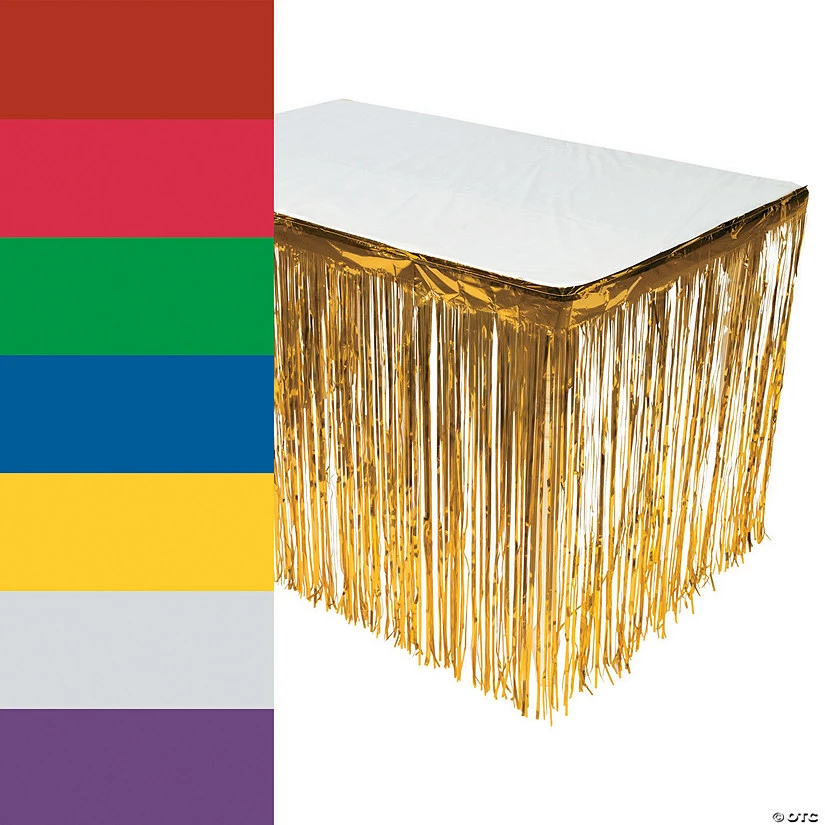 Add to your party supplies and easily detail any table for your event! Our Metallic Fringe Table Skirts are great party decorations for graduation parties, birthdays, luaus, baby showers, wedding receptions and other celebrations. Match this skirt to the rest of your party or event color scheme! Plastic. 9 ft. x 29″
