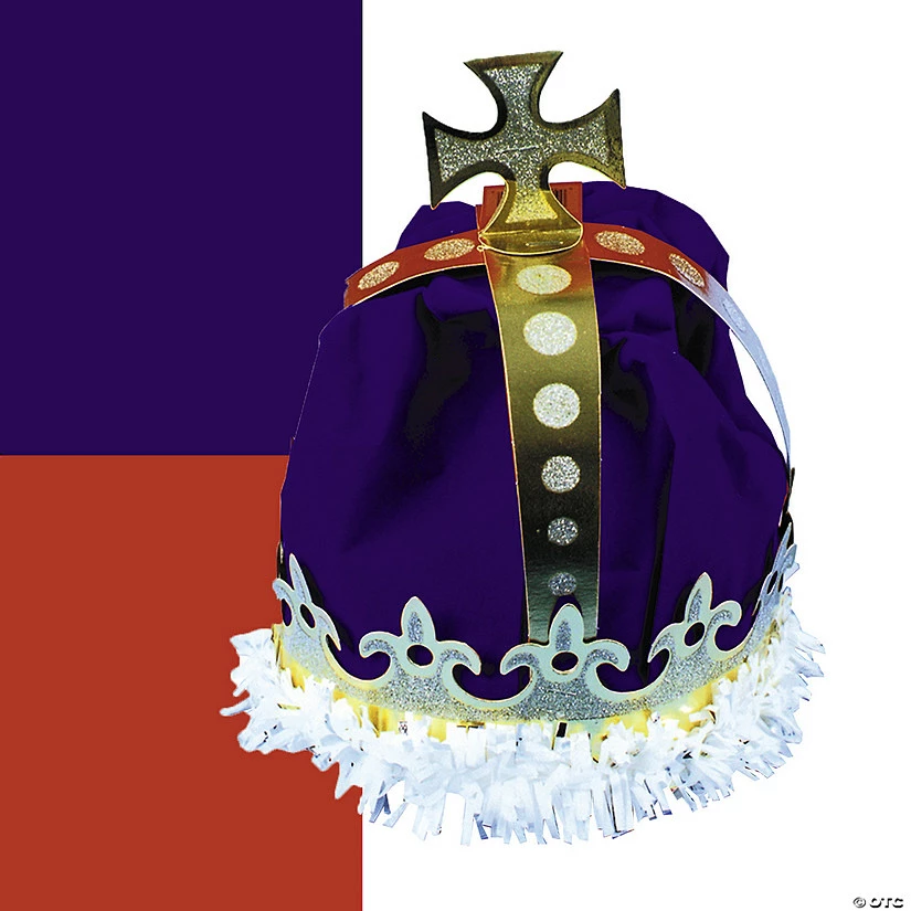 Paper crown with gold foil band trimmed with glitter and white fringed tissue. Royal Blue or Regal Red flocking on crown give it a more expensive look.