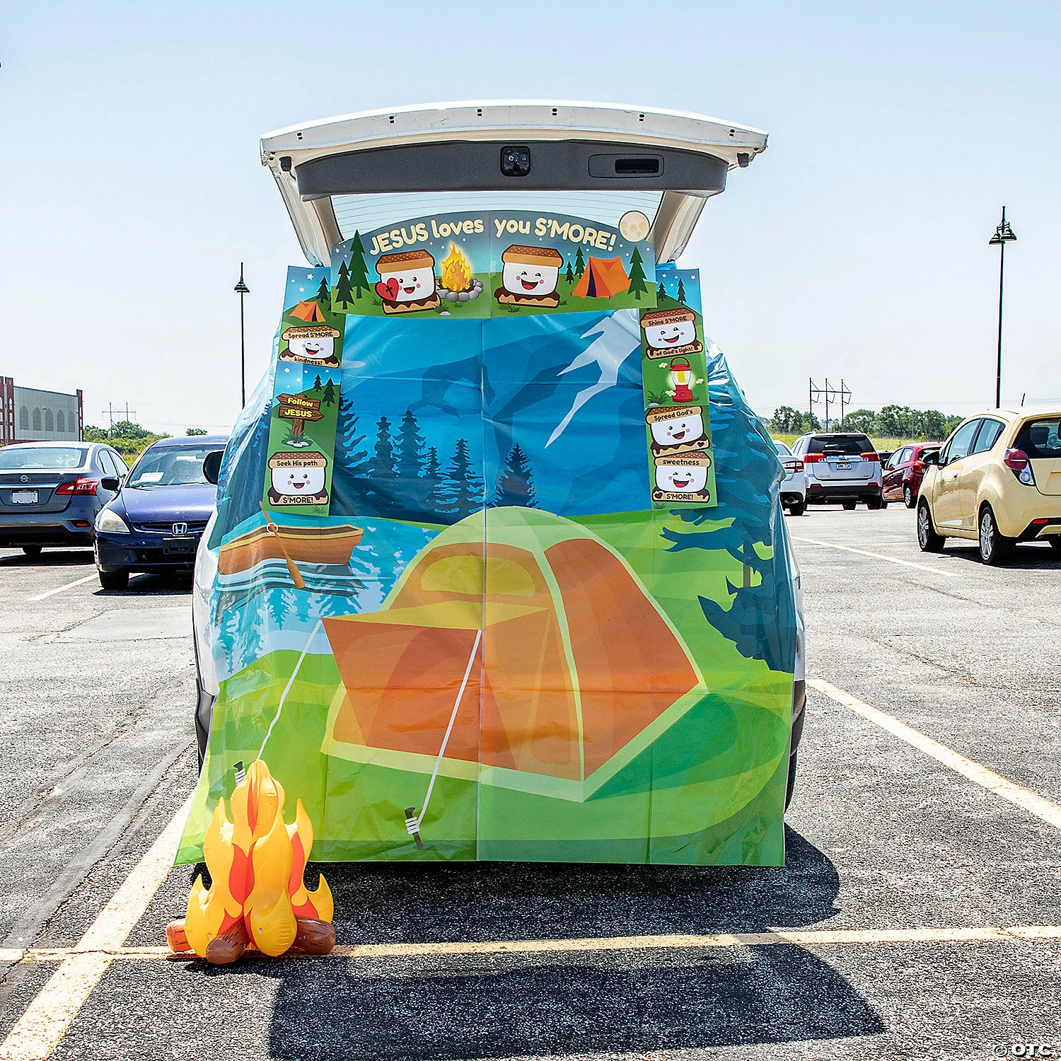Be the happy camper at your church trunk-or-treat event! This convenient kit allows you to decorate your vehicle with a camping theme that celebrates Jesus. Trick-or-treaters will be delighted to come get candy from this adorable assembly of vehicle decorations. (5 pcs. per unit)Includes:• 3-pc. Plastic Camp Scene Backdrop (Assembled, 9 ft. x 6 ft. Simple assembly required.)• 1 Vinyl Inflatable Campfire (Inflated, 18” x 16”)• 1 set Cardstock Jesus Loves You S’more Door Border (Assembled, 36 1/2” x 66” 7 pcs. per set. Simple assembly required.)• Assortments are subject to change at any time and may vary from picture shown. Substituted items will be similar in nature.