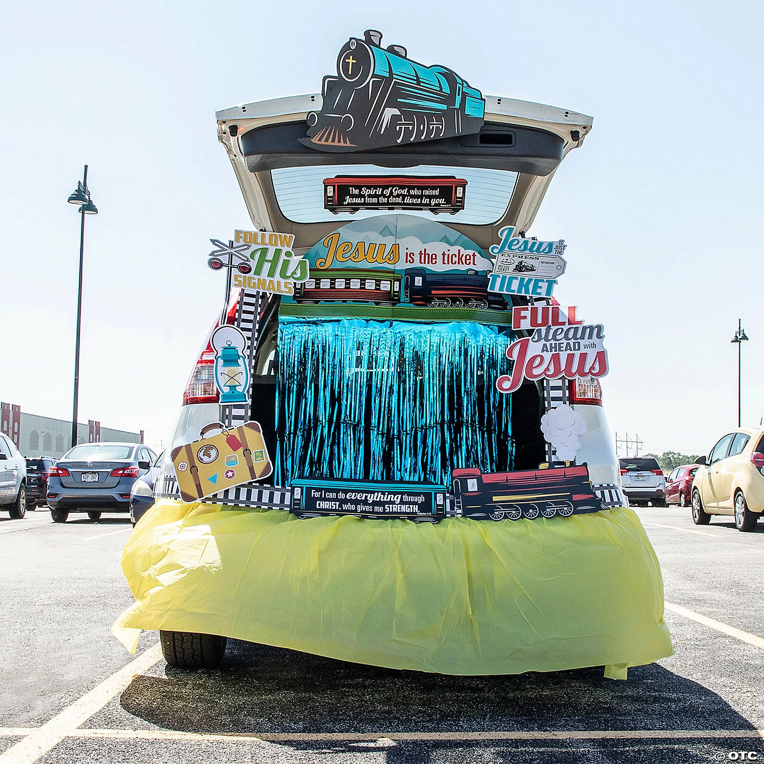 All aboard for some Halloween fun! Take the railroad to trick-or-treating with this exciting decorating kit. Your car will be the best decorated for your church trunk-or-treat event. The included signage has a religious theme, so you can celebrate Jesus while handing out candy treats! (3 pcs. per unit)Includes:• 1 set Cardstock Railroad VBS Bulletin Board Set (3 1/4″ x 23 3/4″ – 12″ x 25″ 28 pcs. per set)• 1 Cardstock Border and Plastic Fringe Railroad VBS Door Curtain with Border (3 ft. x 88”)• 1 Plastic Yellow Pleated Table Skirt (14 ft. x 29”)• Assortments are subject to change at any time and may vary from picture shown. Substituted items will be similar in nature.